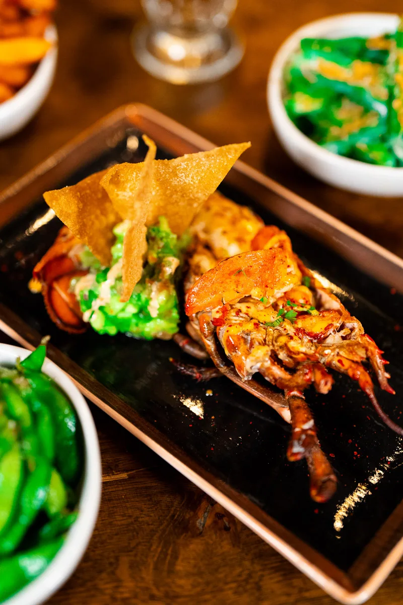This luxurious dish features a half portion of Maine lobster, renowned for its sweet, tender meat. The lobster is served alongside creamy avocado, adding a rich, buttery texture that complements the delicate lobster. Crispy wan tan provides a delightful crunch, offering a contrast in texture to the soft lobster and avocado. The dish is finished with a bold chili-mayonnaise, which adds a spicy, tangy kick that enhances the overall flavor profile. This combination of fresh, creamy, and crispy elements makes for an indulgent and well-balanced seafood experience.